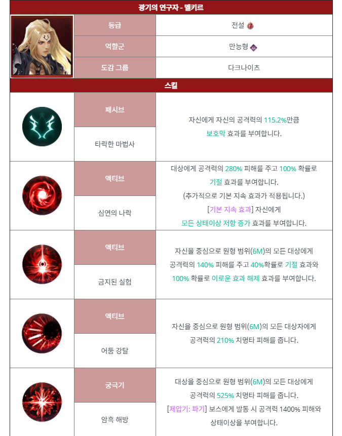 멜키르의 광역 데미지와 비교 불가이지만 멜키리의 궁극기 데미지 퍼센트는 9렙 기준 957%이다