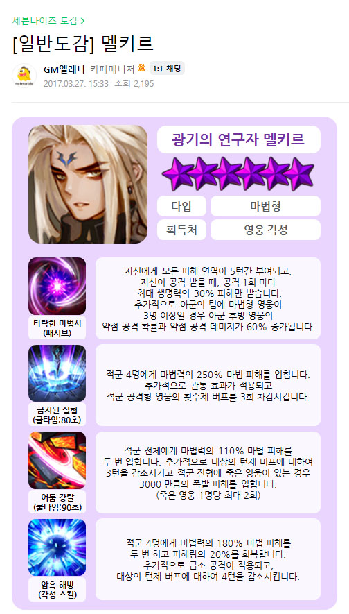 세븐나이츠에서 멜키르는 2017년에 출시되었다