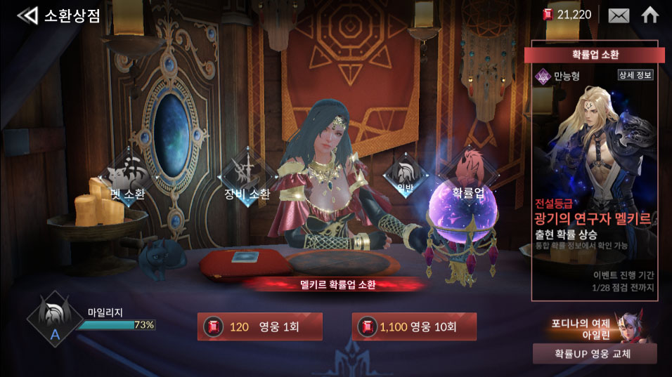 현재 영웅 소환에서 "멜키르"와 포디나의 여제 "아일린"이 확률업 소환 중이다