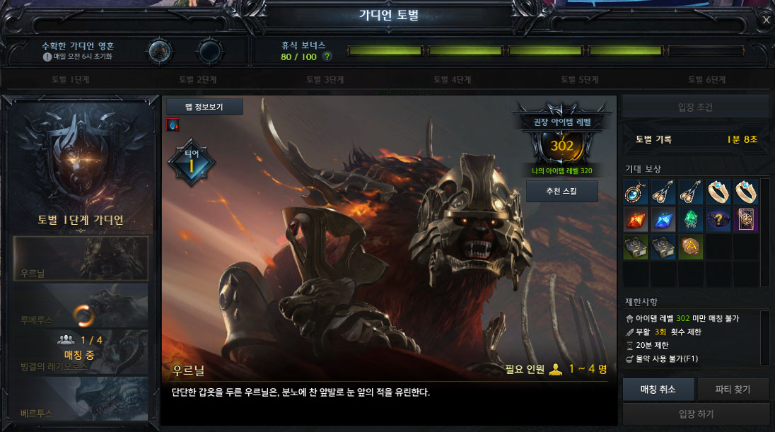 휴식 보너스 게이지가 100프로 이므로 우르닐을 2번 완료하면 넉넉하게 강화할 수 있는 재료를 구할 수 있다