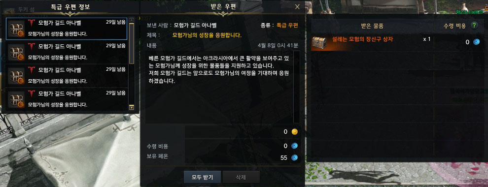 우편으로 장신구도 오고 다음 아이템레벨 보상상자도 온다