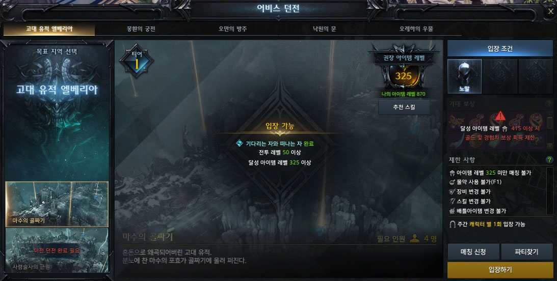 매칭은 아이템 레벨 415만 달성해도 가능하다