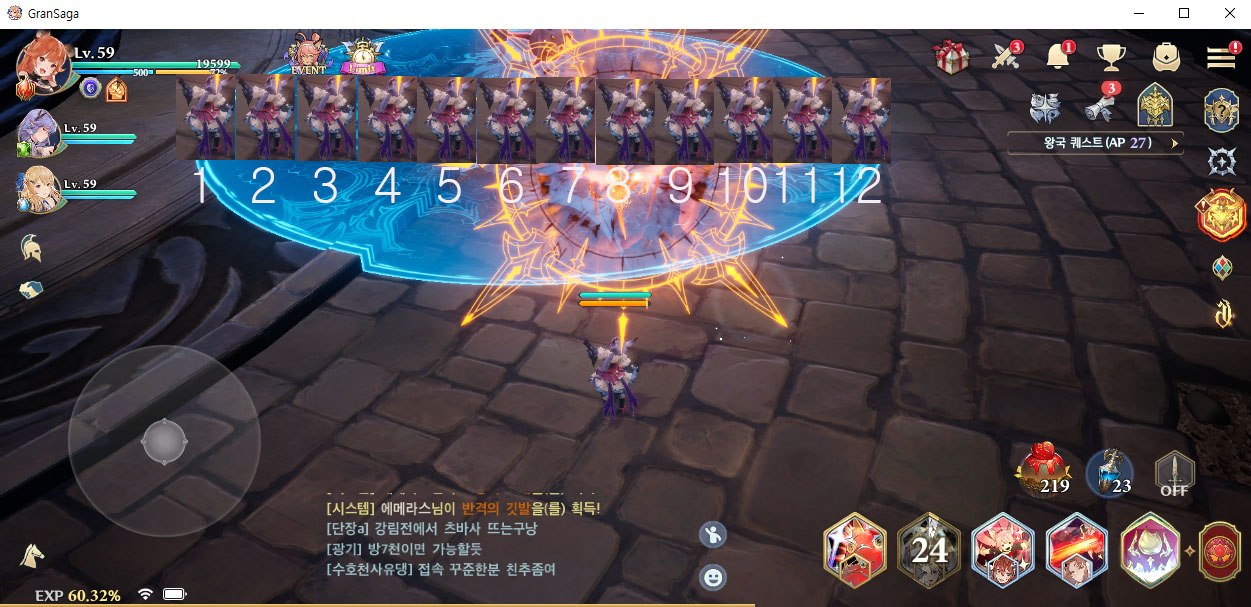 저렇게 12명이 붙어 있는 경우는 없지만 결투장에서 메테오를 시전하면 3명이 다 맞는다고 보면 된다